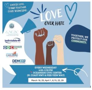 JOIN US for our next peaceful protest at the Oceanside Civic Center on March 25, April 1, 8, 15, 22, 29.
