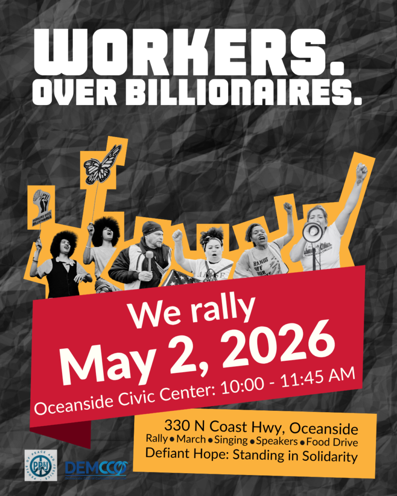 On Saturday morning, May 2, from 10-noon, we are planning to have a protest at the Oceanside Civic Center from 10-12 pm. So save the date. We are hoping to do a march down to Pacific Ave and then back up Mission to the Civic Center. Possibly pausing in front of the theater for a bit of singing and then lining Coast Hwy with our bodies and signs. The theme is defiant hope!